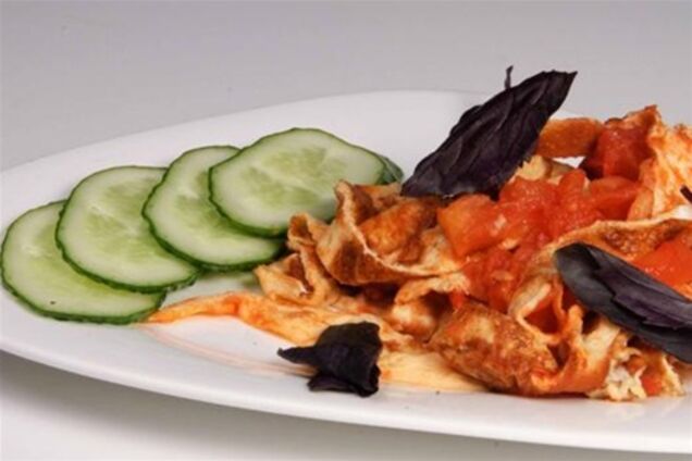 Добавил "яичную лапшу" к шкворчащим помидорам и обжарил все вместе еще пару минут.