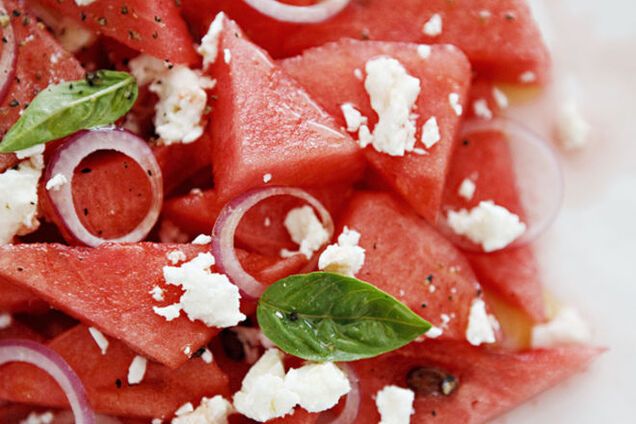 Предлагаем вам рецепт суперлегкого, вкусного салата из арбуза и сыра фета.