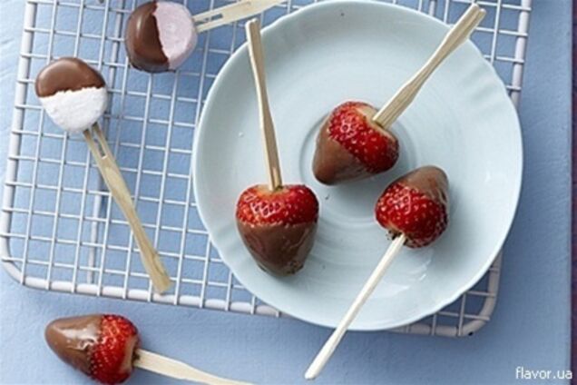 2. Выстелите противень бумагой для выпечки. Наколите на зубочистки клубнику и маршмеллоу (по отдельности). Макайте в растопленный шоколад, избыток стряхивайте, выложите на противень. Охладите перед подачей.